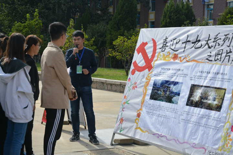 喜迎十九大,共筑中国梦。化工学院举行“忆往昔峥嵘岁月,展未来任重道远”图片展、书法展和绘画展,以介绍党的历史和党的各次代表大会为核心,集中展示了党的蓬勃发展以及化工学子的爱党敬党的情怀。用红绳穿起党的各次代表大会的照片,历史就好像又一幕幕的重回眼前。飘逸的书法,生动的绘画,显示了化工学子的蓬勃朝气。同学们自发前来参观,在观看图片的同时,学习了党史,感受到了党的光辉与魅力。