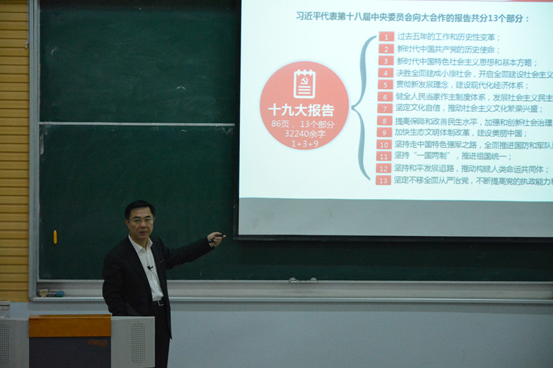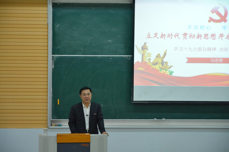 会上,马连湘以“不忘初心 牢记使命”为主题,全面解读中国共产党第十九次全国代表大会中习近平总书记的报告内容。他以“139”架构对十九大报告全文进行了系统梳理,“1”是过去五年的历史性成就和变革,“3”是“新时代中国共产党的历史使命、新时代中国特色社会主义思想、全面建设社会主义现代化国家新征程”,“9”是“经济建设、政治建设、文化建设、社会建设、生态文明建设、国防和军队现代化建设、祖国统一大业、构筑人类命运共同体、从严治党”。报告中马连湘着重对 “一个重大思想”“两个重大判断”“四个伟大”“八个明确”“十四个坚持”等新提法、新概念进行了讲解。他还从从十九大报告中对教育,尤其是高等教育所占的重要地位进行了深刻分析,解释了十九大对我们办学理念、办学形式、办学管理、办学目标的影响,并进一步讲述了评估对教育的重要意义。马连湘用生动的语言,形象的事例向大家详细阐述了十九大报告蕴含的深刻道理,带领大家学习了习近平总书记十九大报告中的丰富内涵和意义,提高了全体党员的政治思想觉悟。